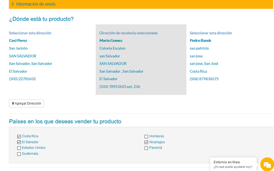 Información de envío: Colocas la dirección a la que es necesario ir a retirar tu producto para la entrega y seleccionas los países en los que deseas venderlo.