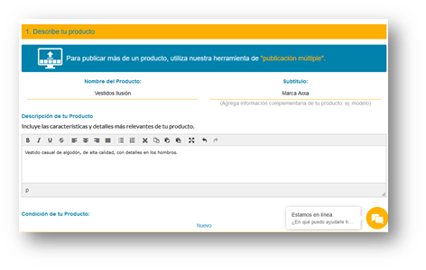 Describe tu producto a detalle en la sección asignada no se permite que pongas URL ni números de contacto, cuida tu ortografía.