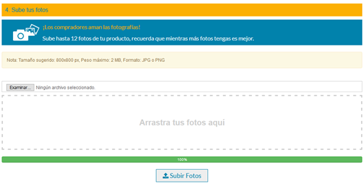 Sube tus fotos: Sube las fotografías que has tomado de tus productos, trata la manera de que estas sean lo más atractivas posibles y que respeten las medidas que la plataforma exige 800×800 px. Revisa este contenido que te puede ayudar un poco a sacar el mayor provecho de tus fotografías.